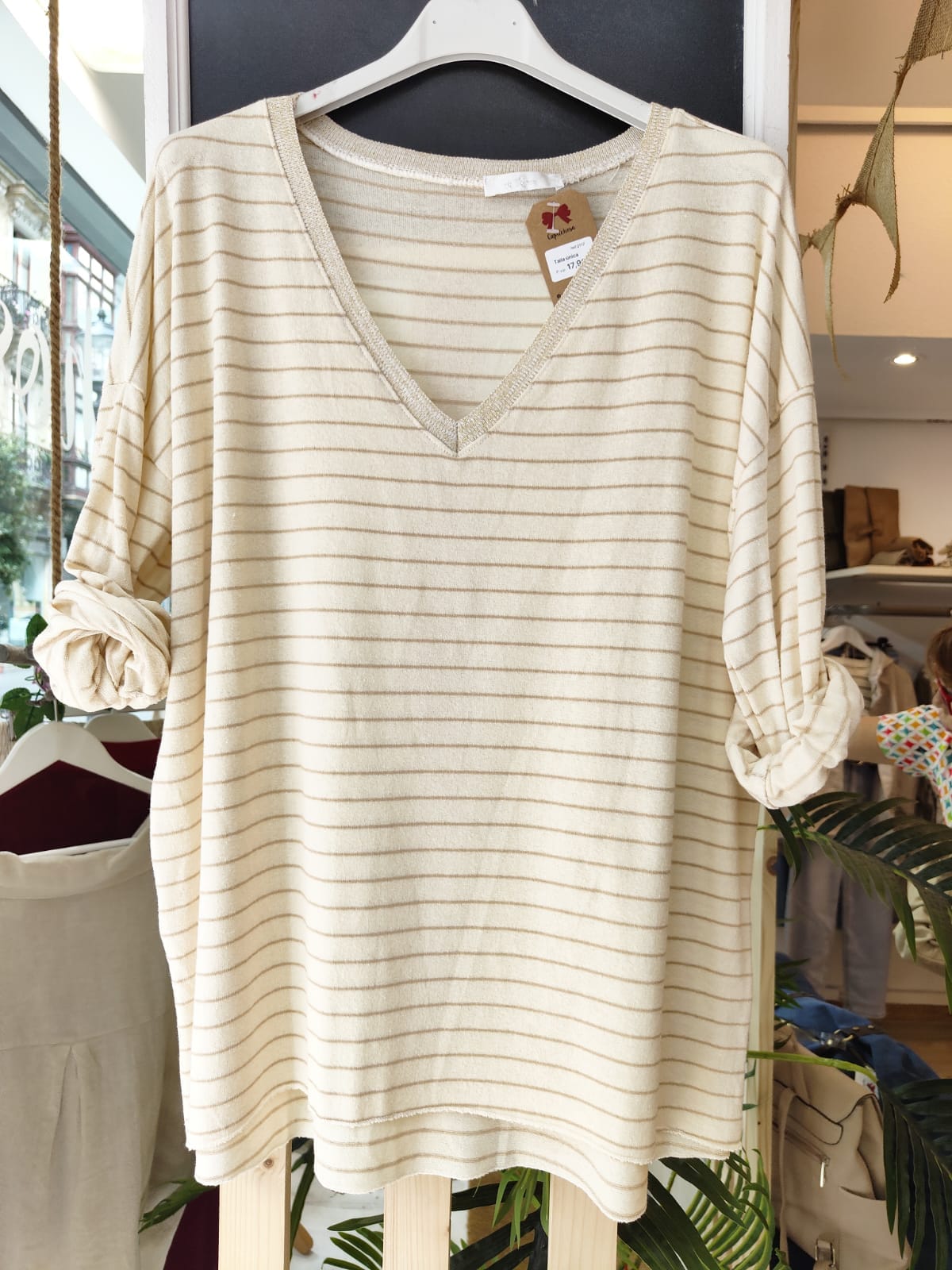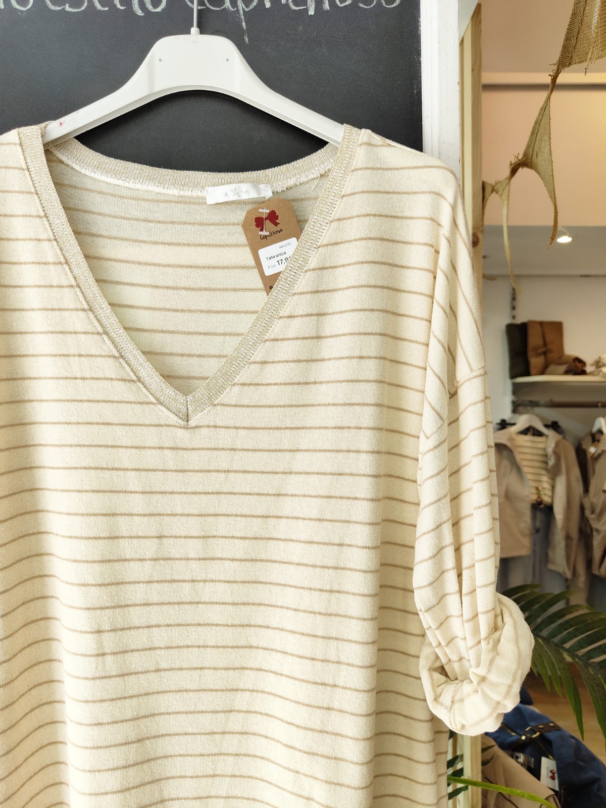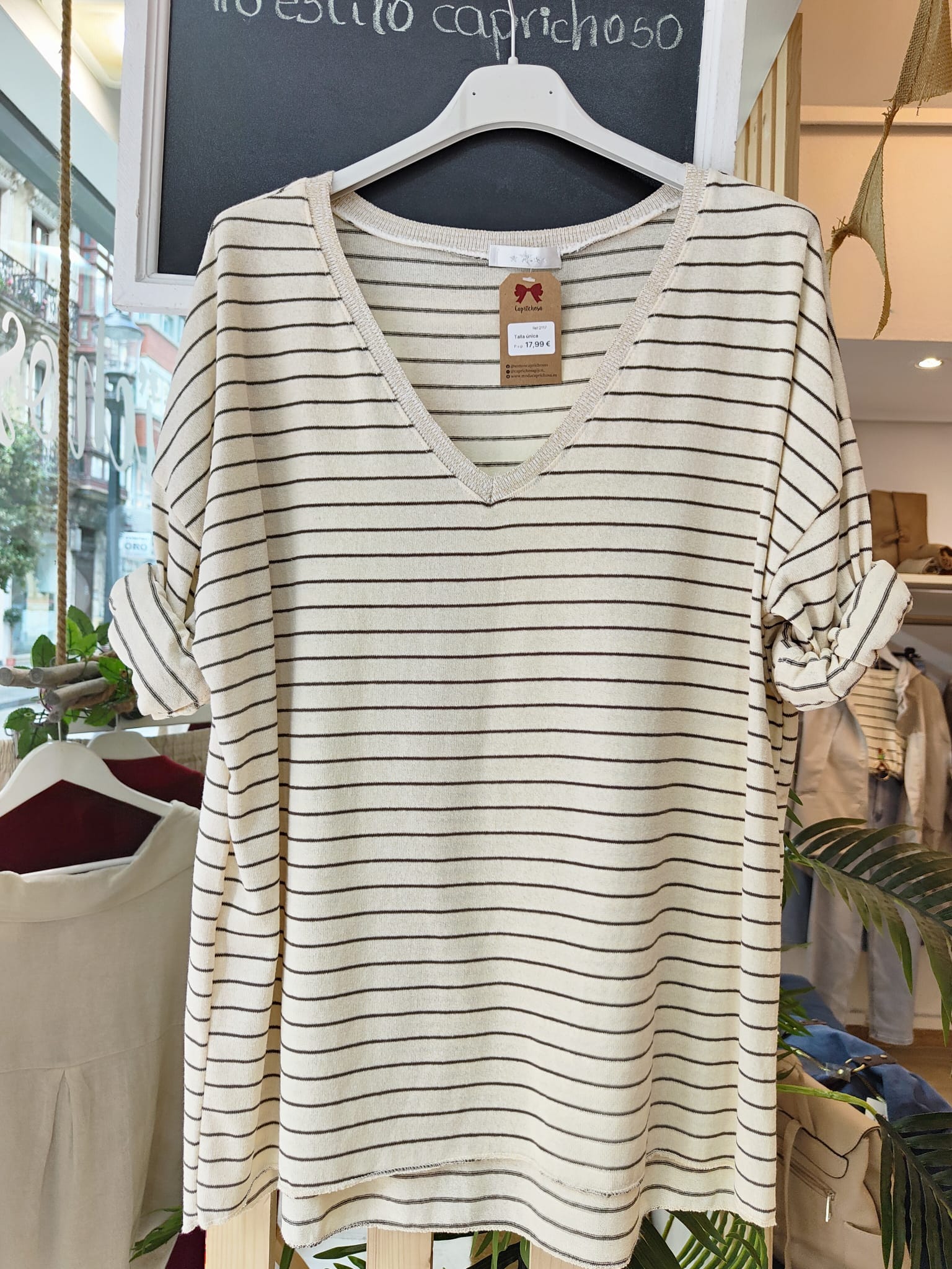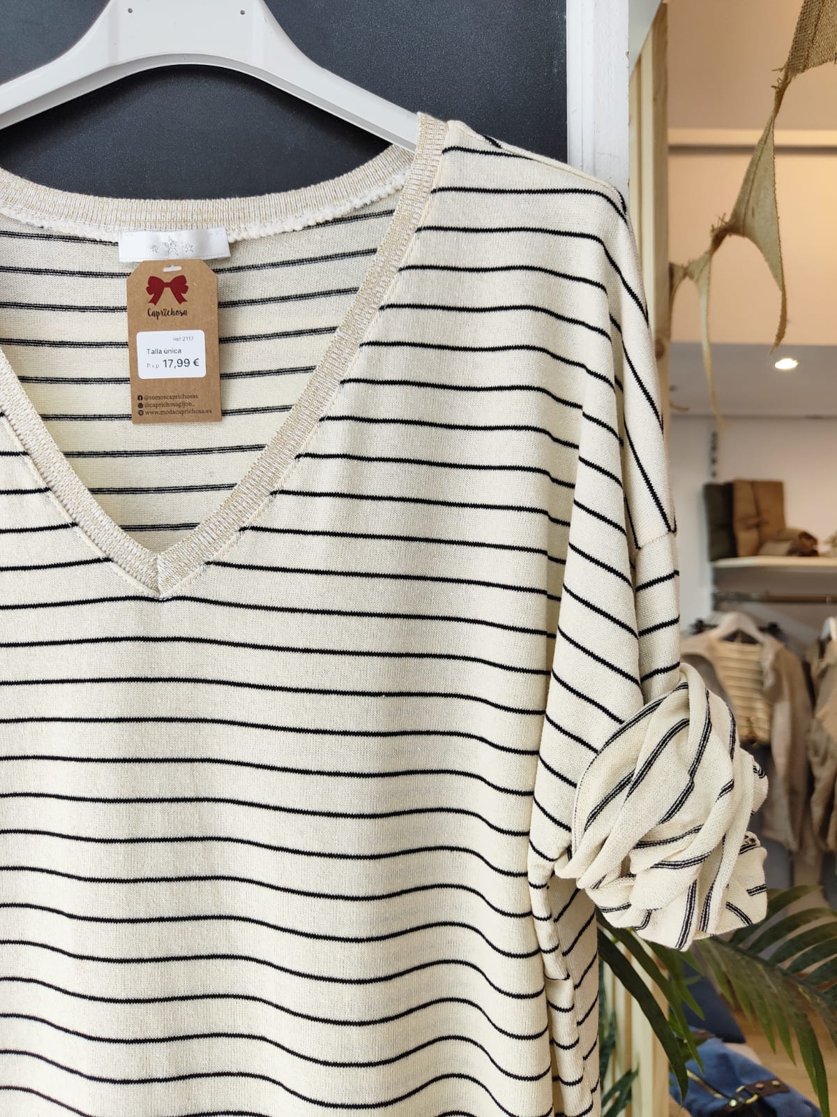 Jersey o camiseta de punto fino con diseño de rayas. Corte recto, escote en pico y acabado en canalé en puños y bajo. Perfecto para un look cómodo, casual y con estilo. Ideal para entretiempo o para combinar con vaqueros o faldas.