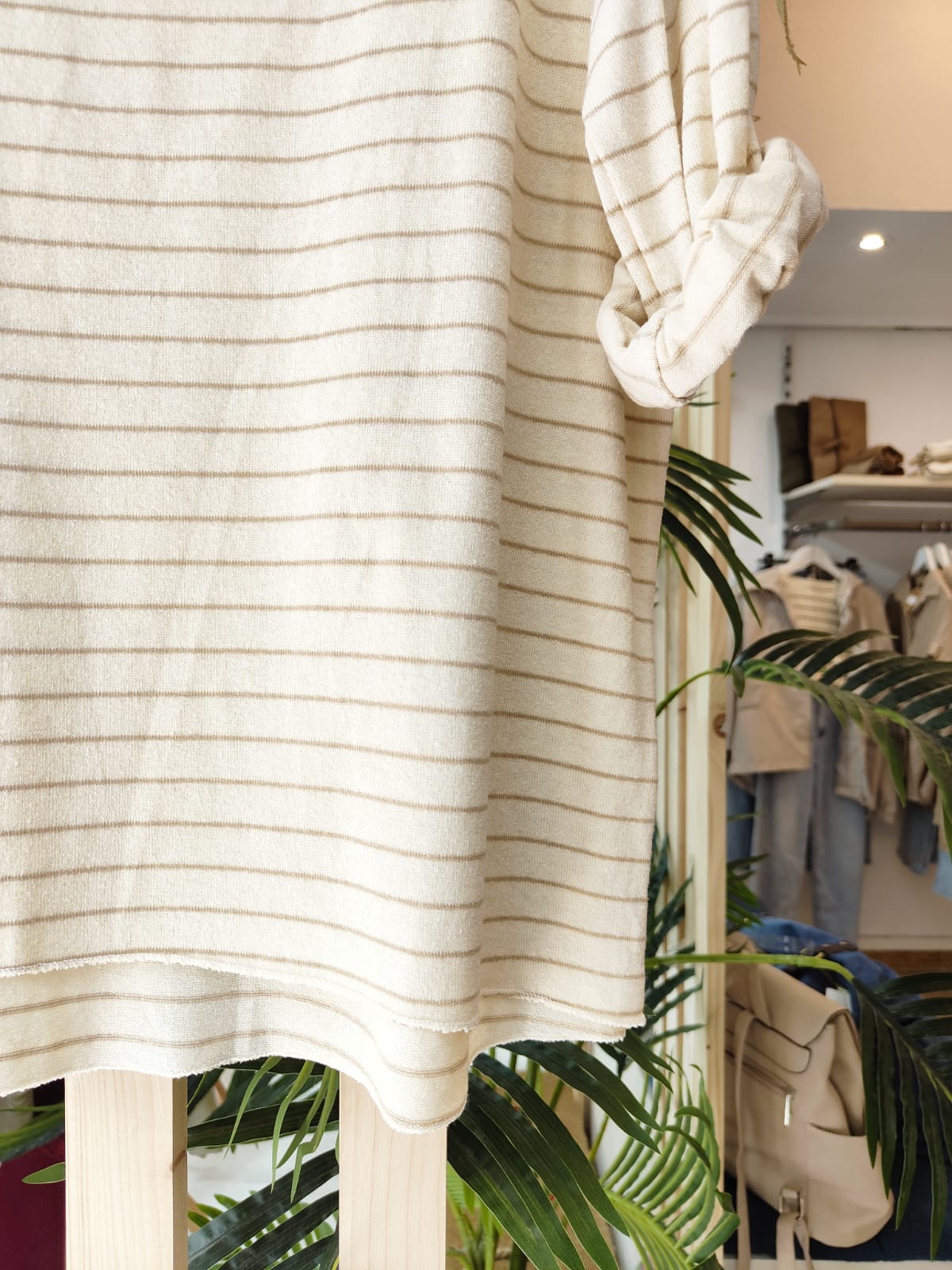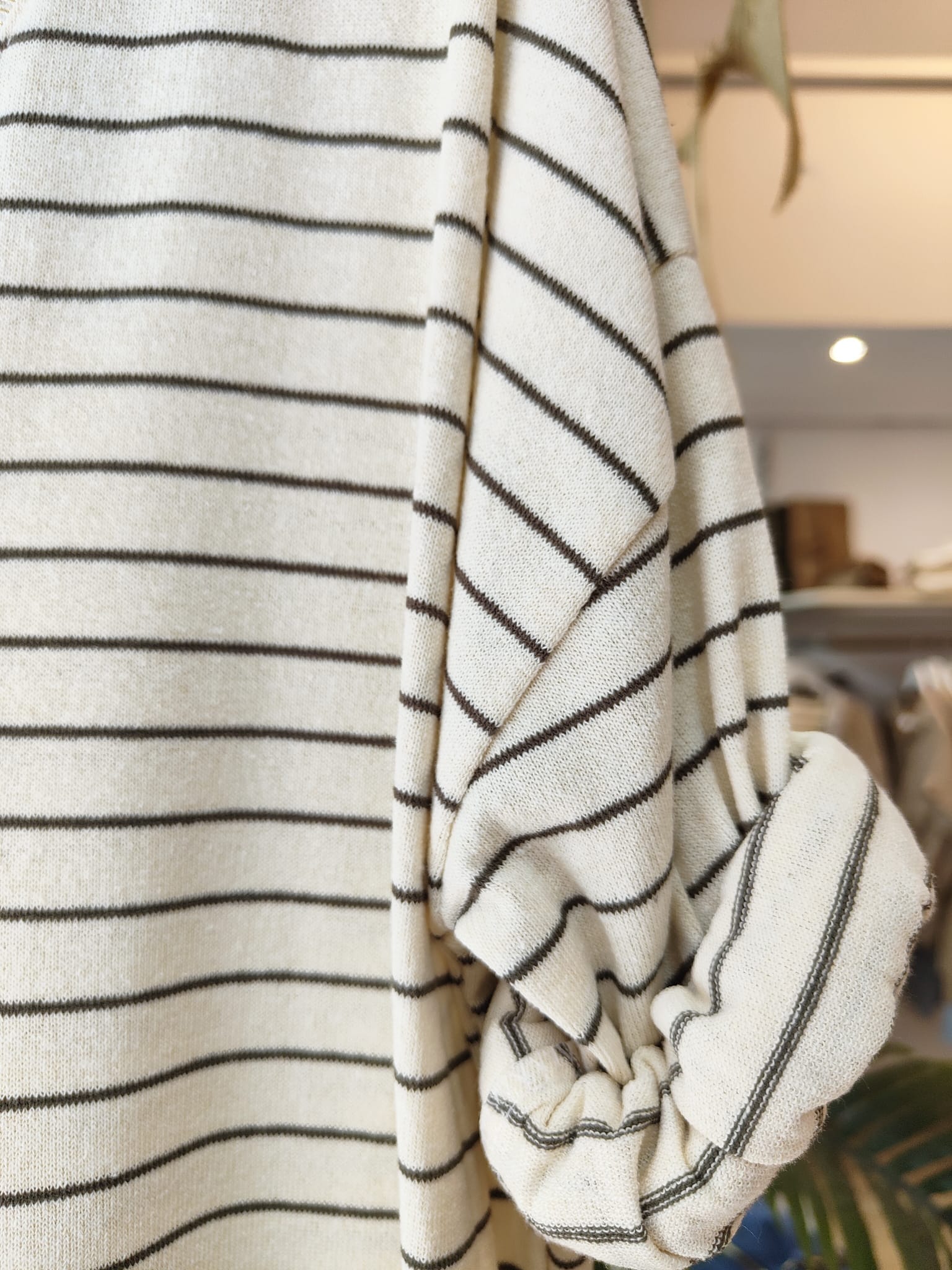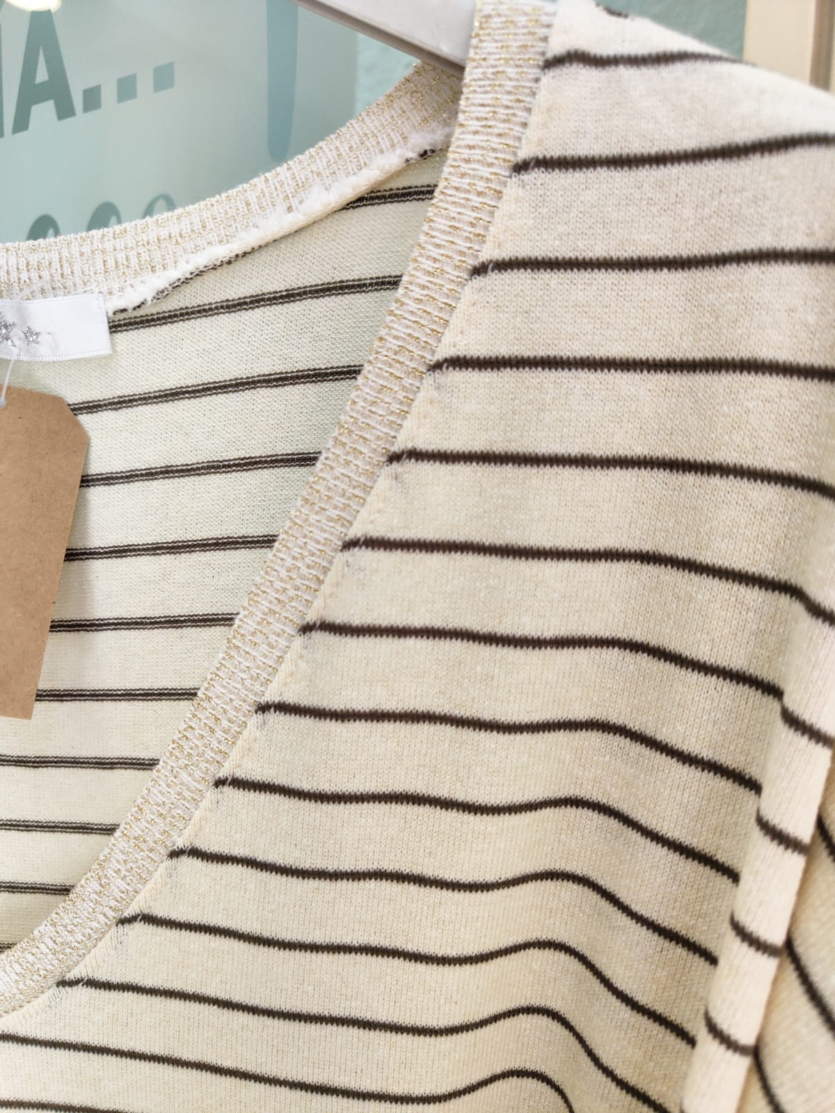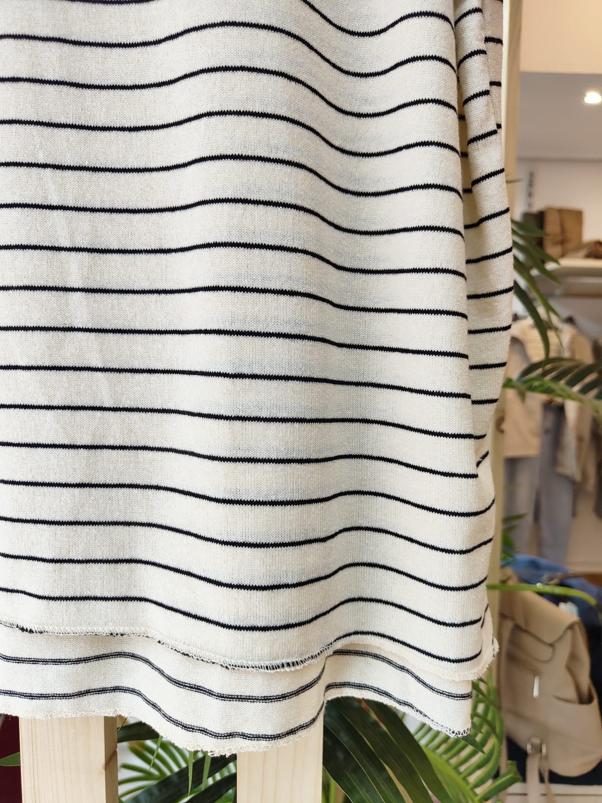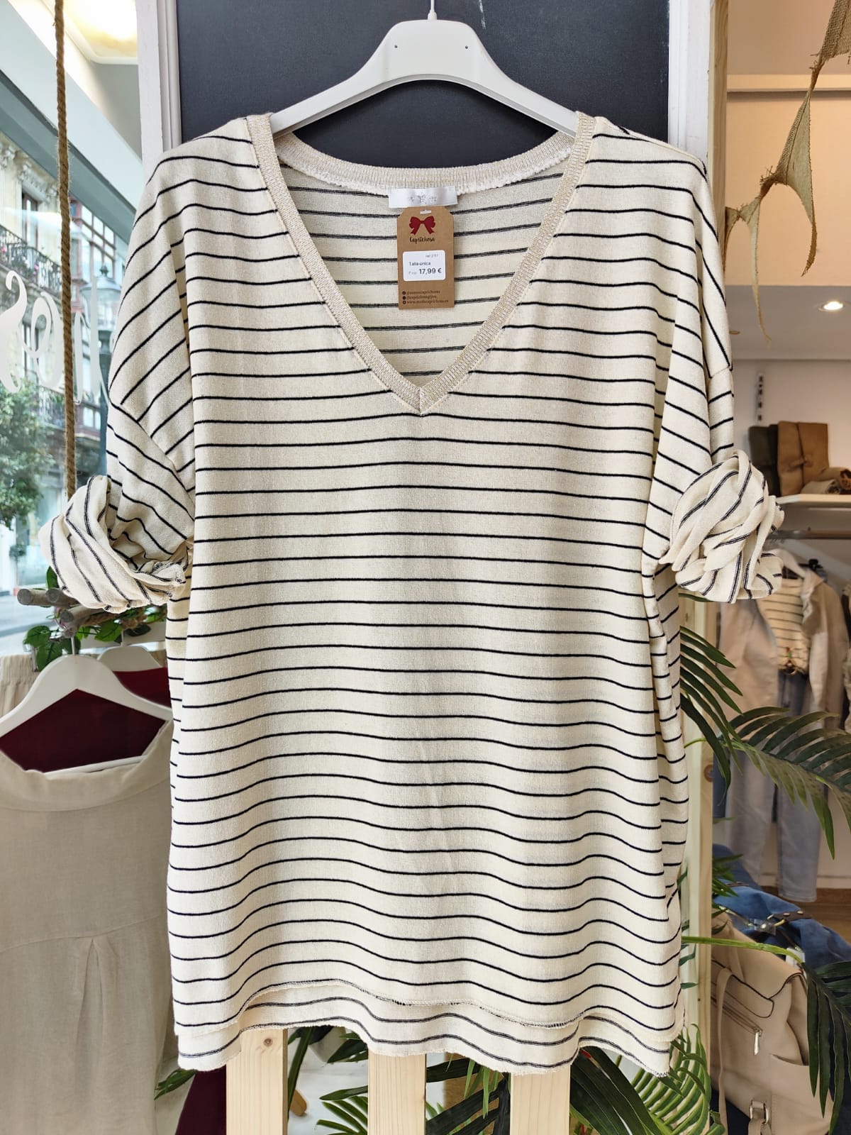 Jersey o camiseta de punto fino con diseño de rayas. Corte recto, escote en pico y acabado en canalé en puños y bajo. Perfecto para un look cómodo, casual y con estilo. Ideal para entretiempo o para combinar con vaqueros o faldas.