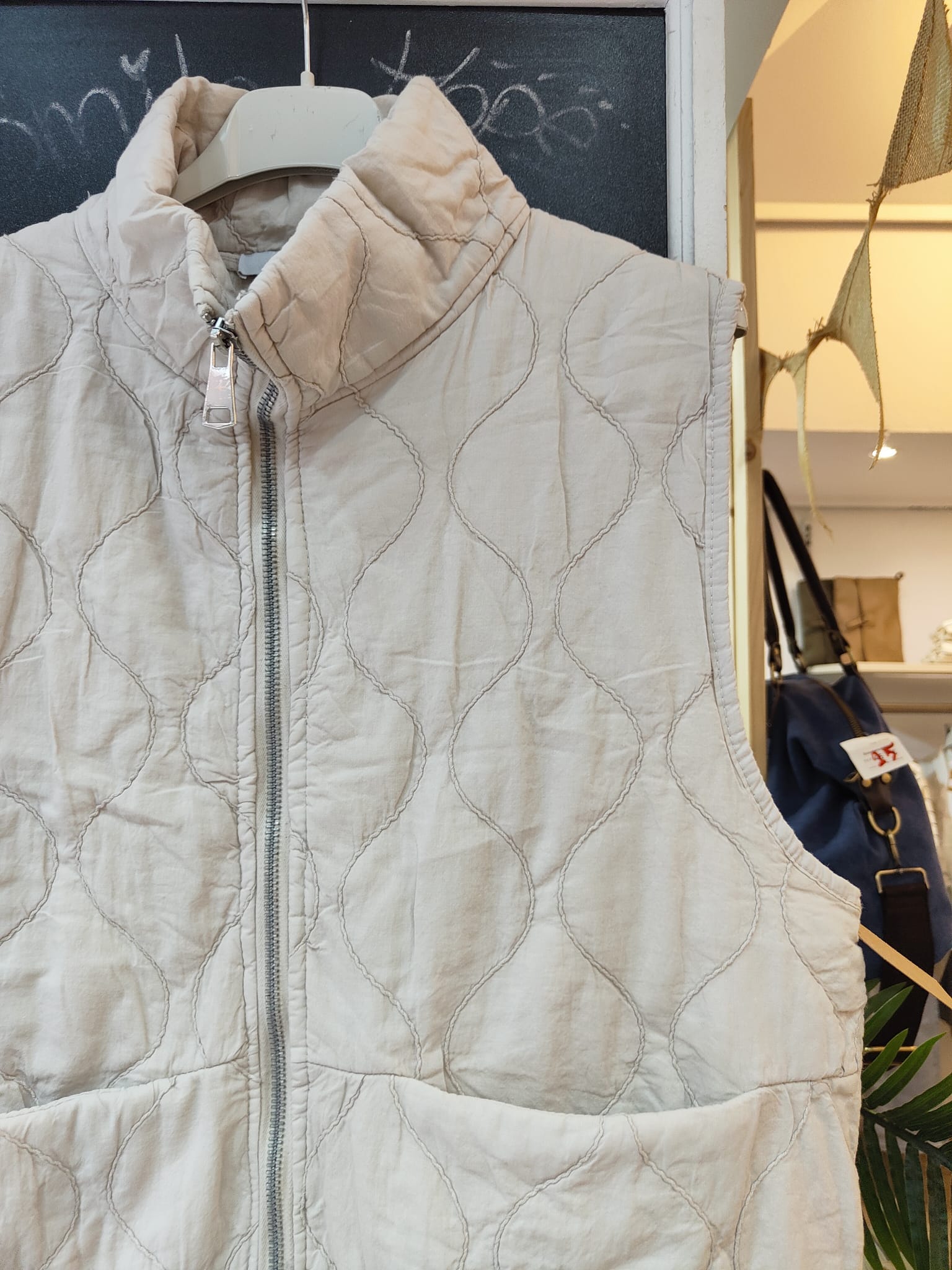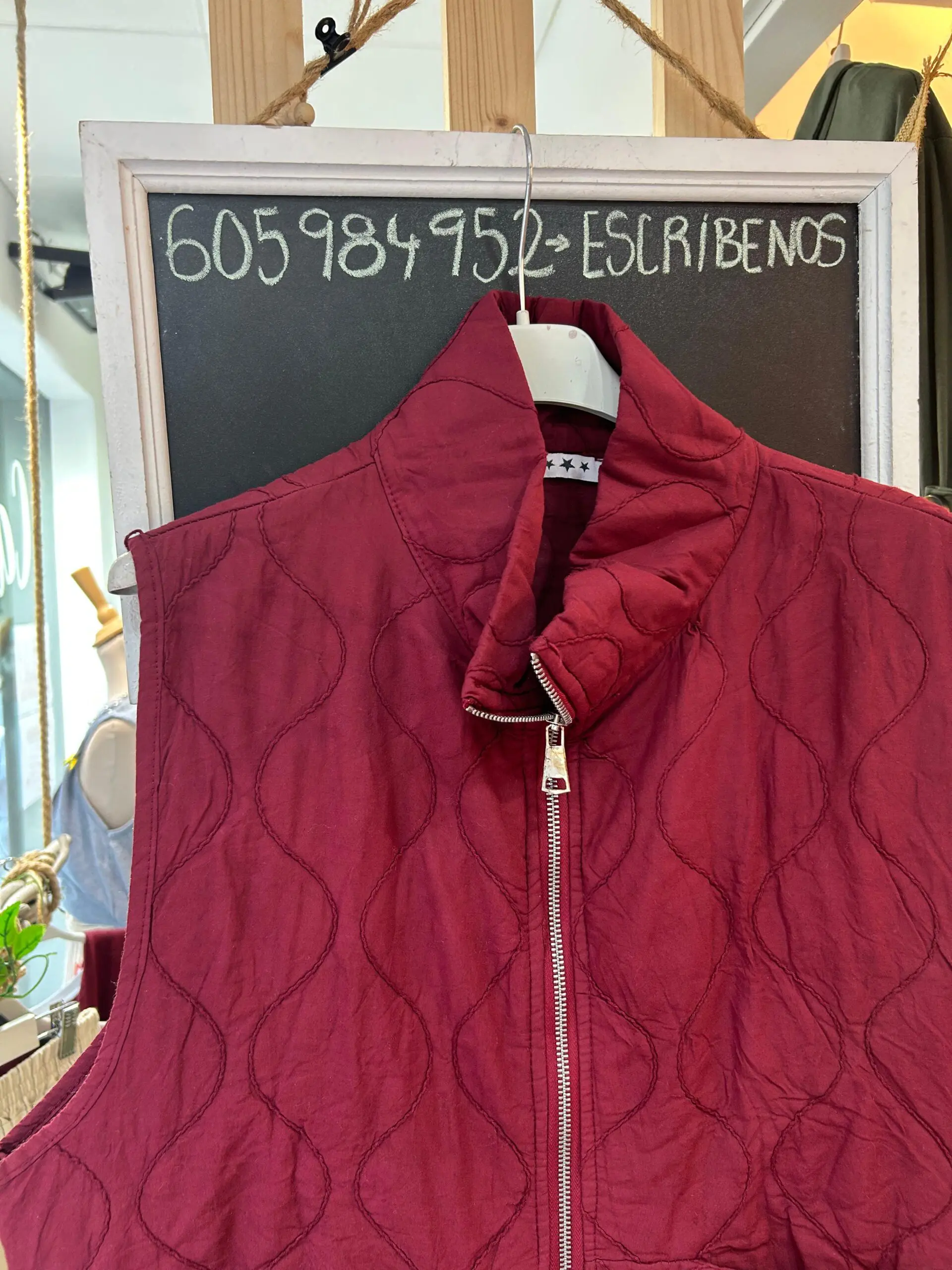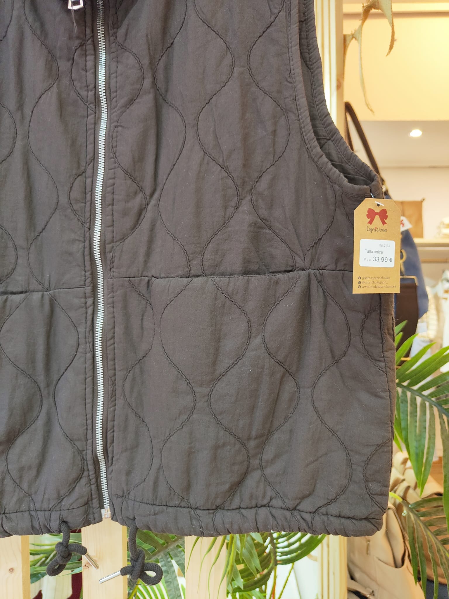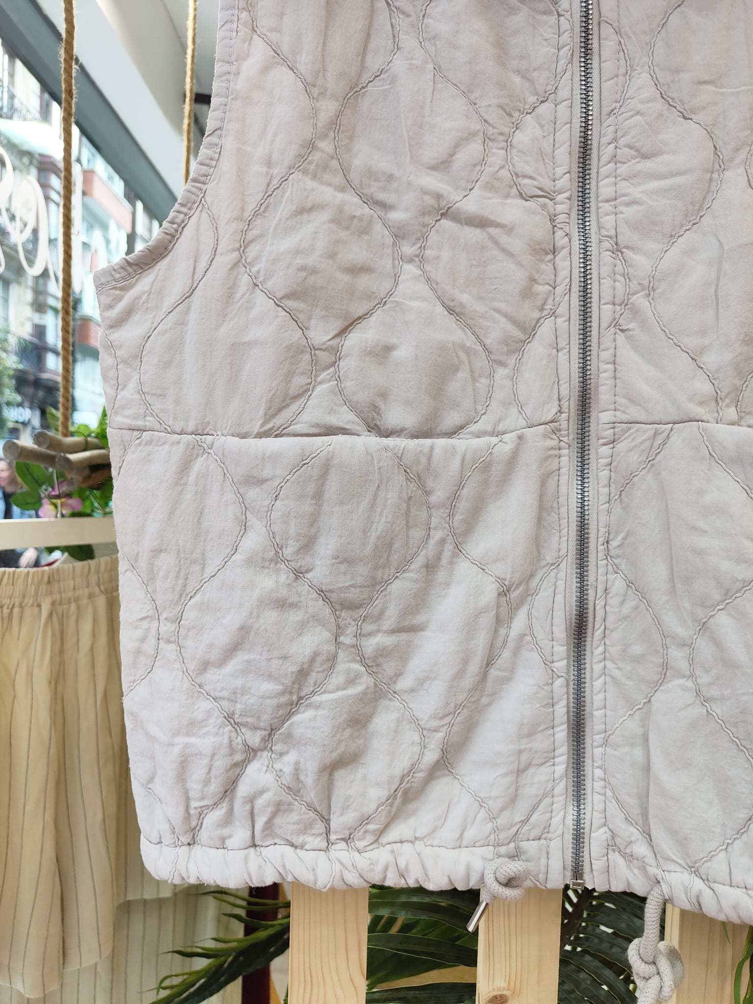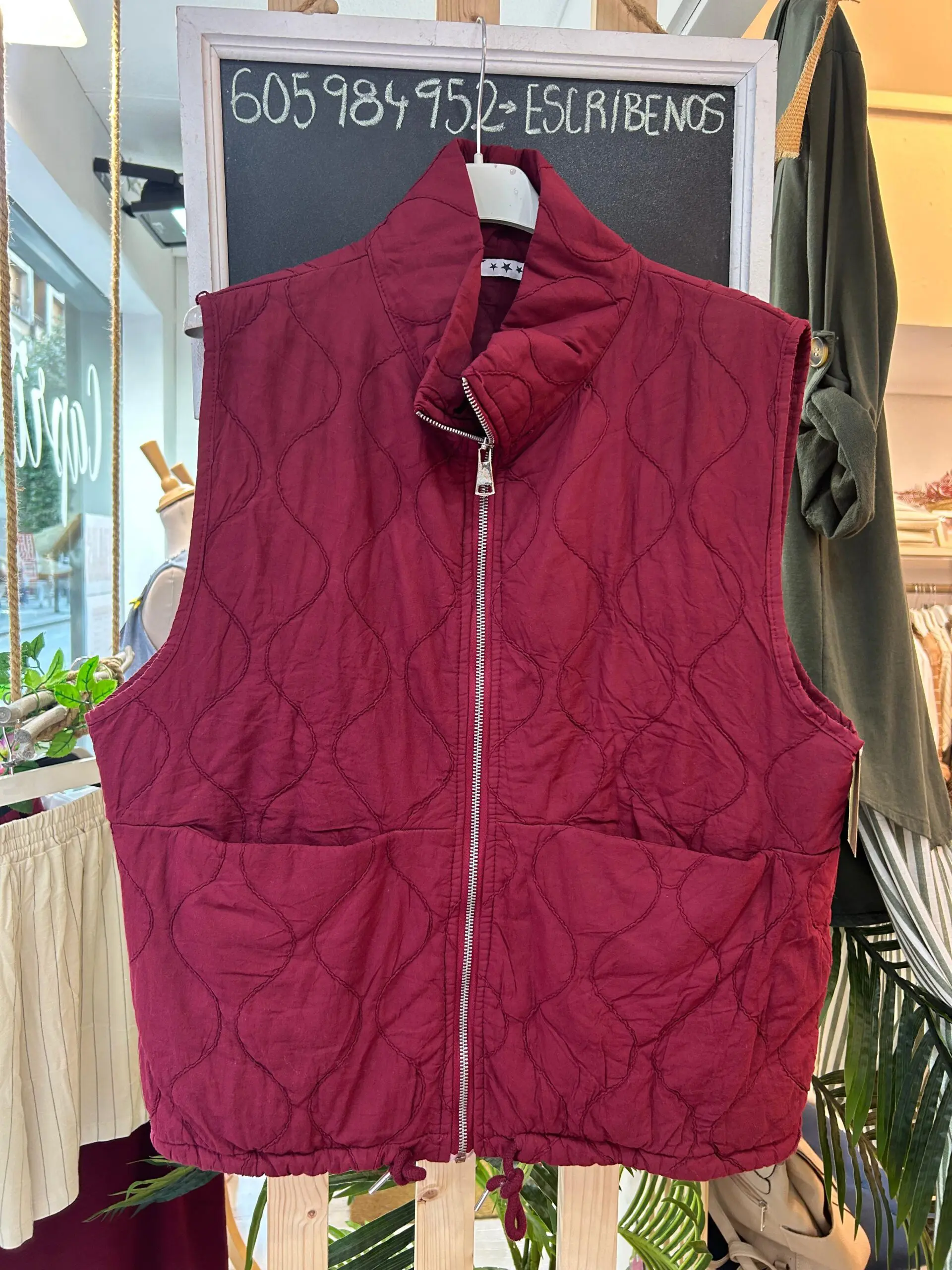 Chaleco con dibujo de rombo, con bolsillos delanteros, cremallera y puede ajustarse en la zona de abajo.