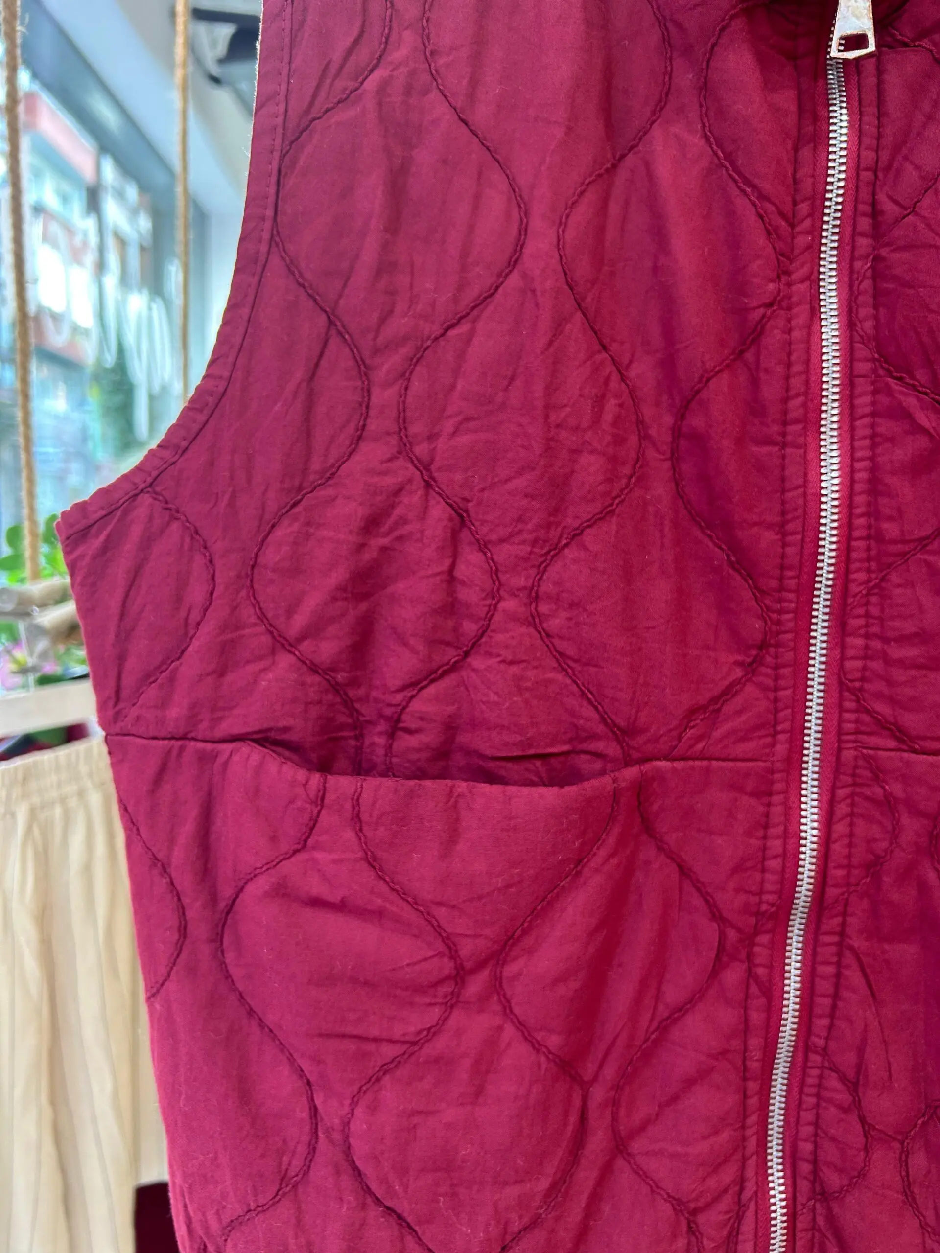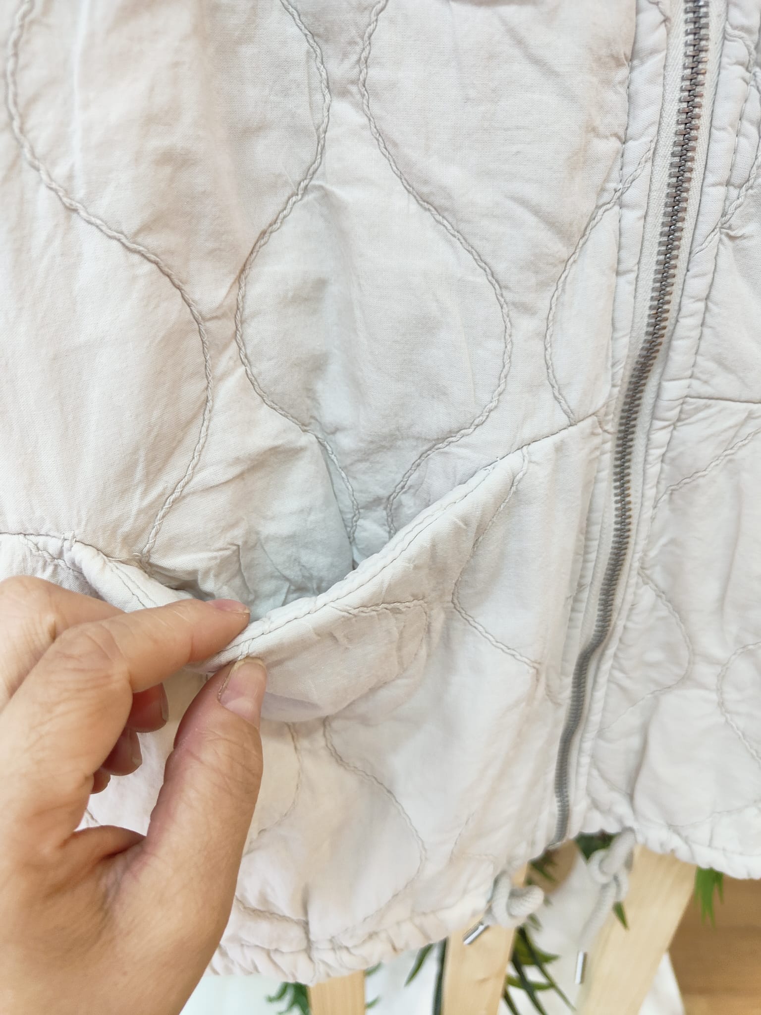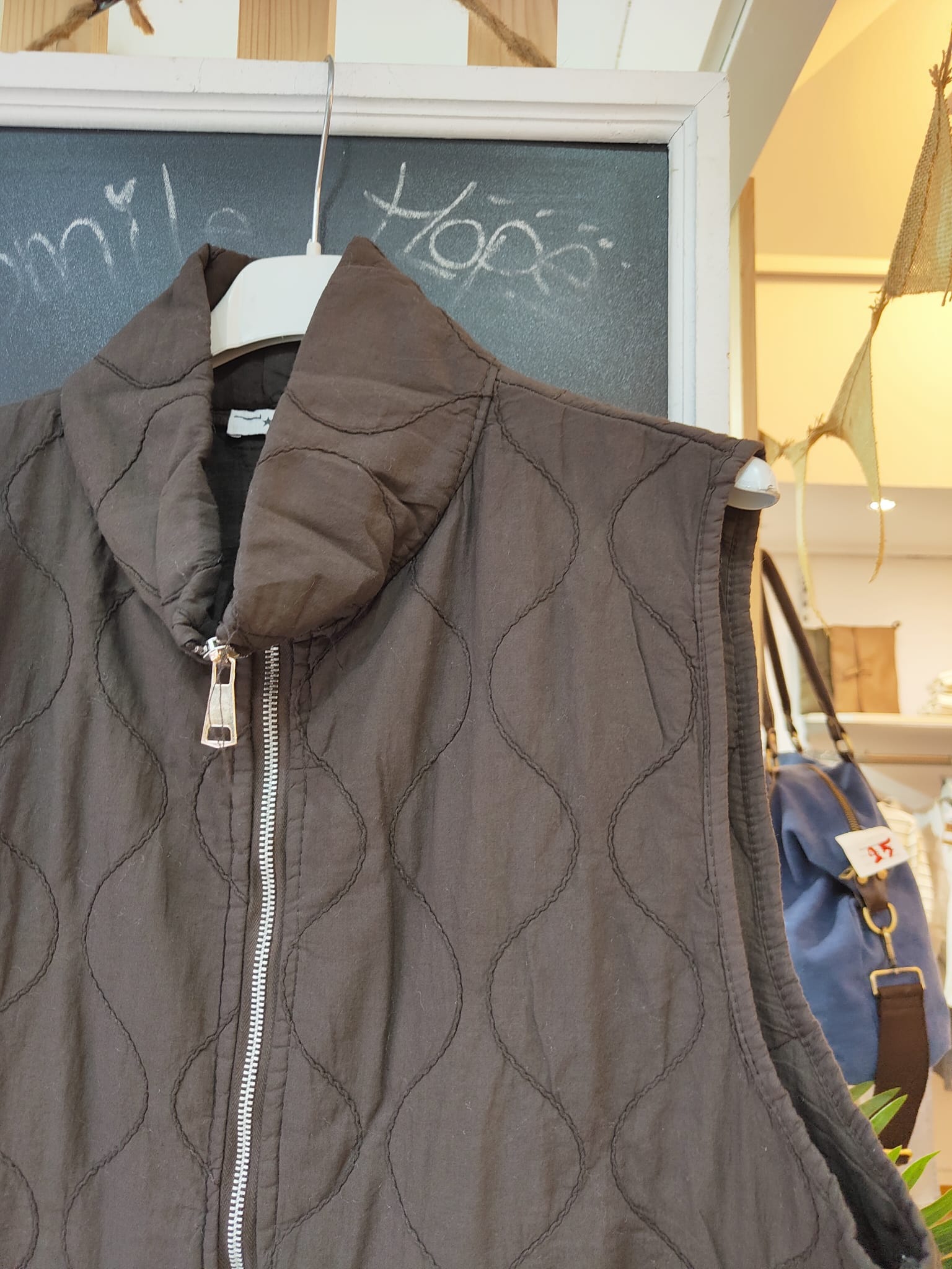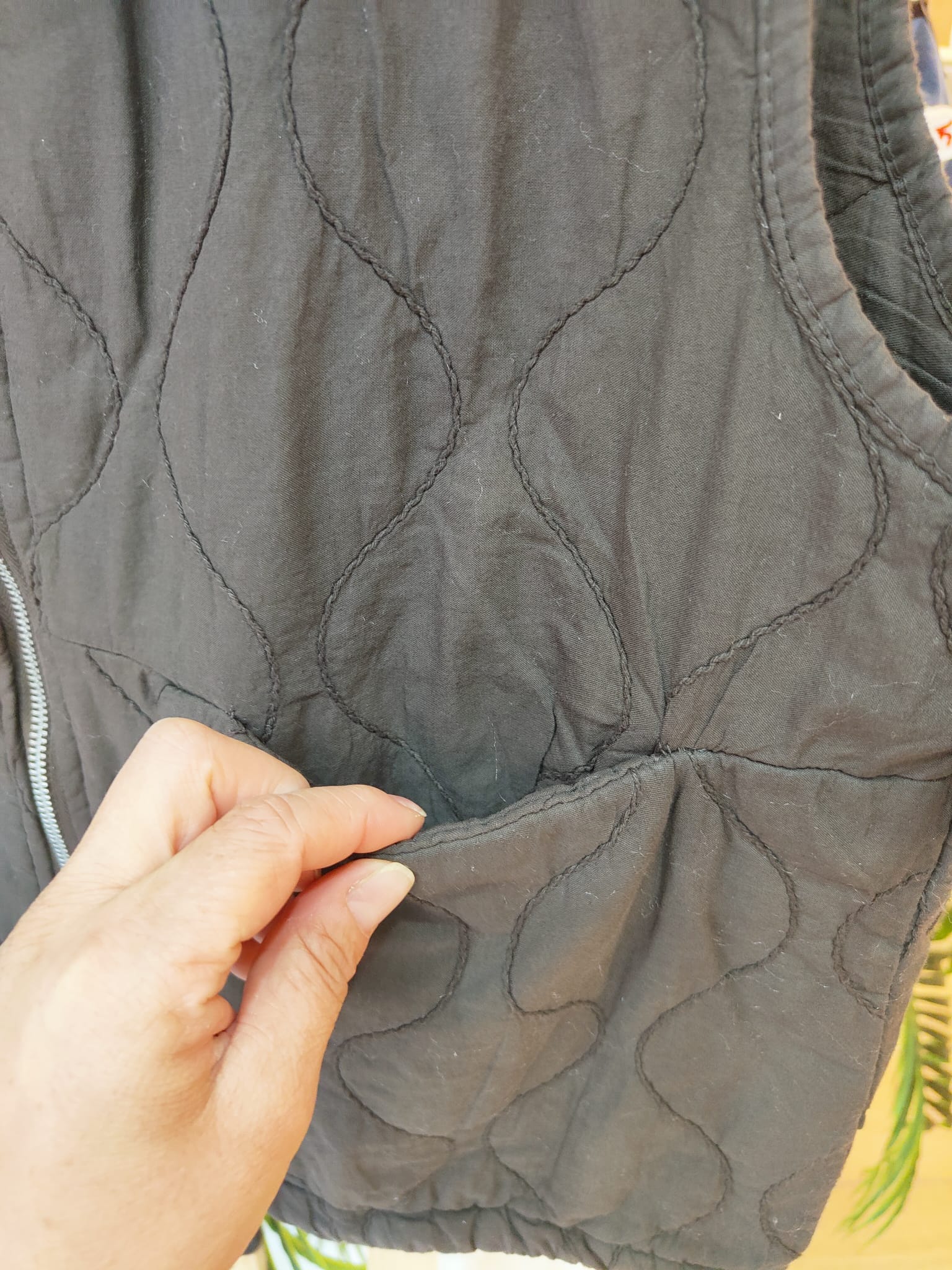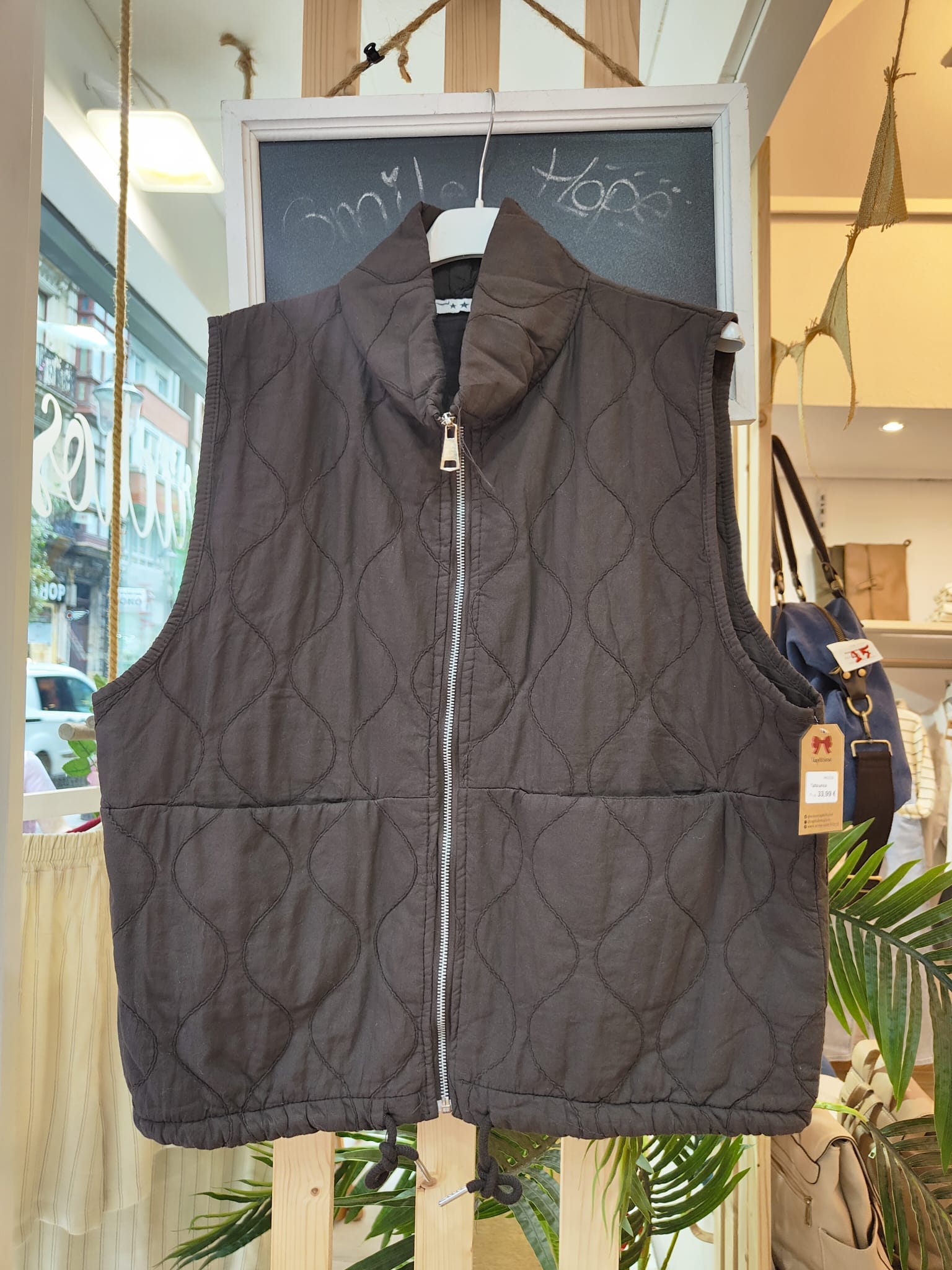Chaleco con dibujo de rombo, con bolsillos delanteros, cremallera y puede ajustarse en la zona de abajo.