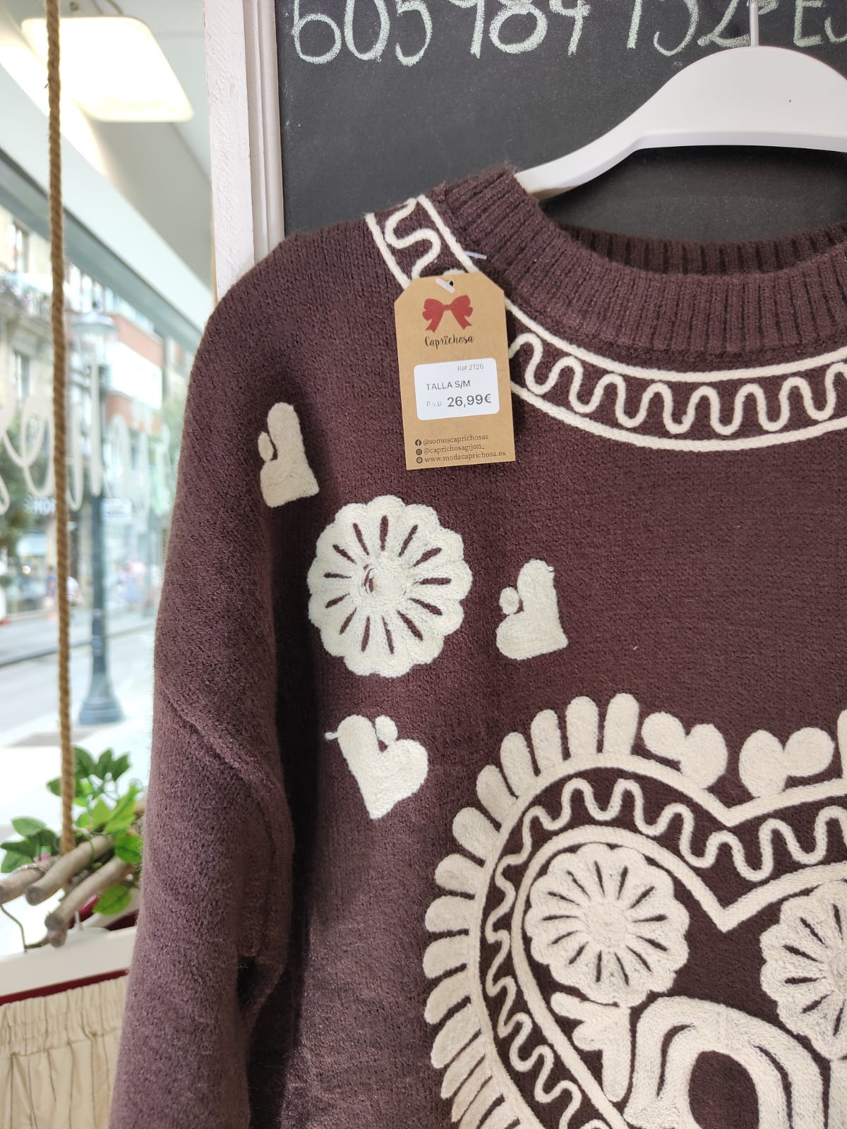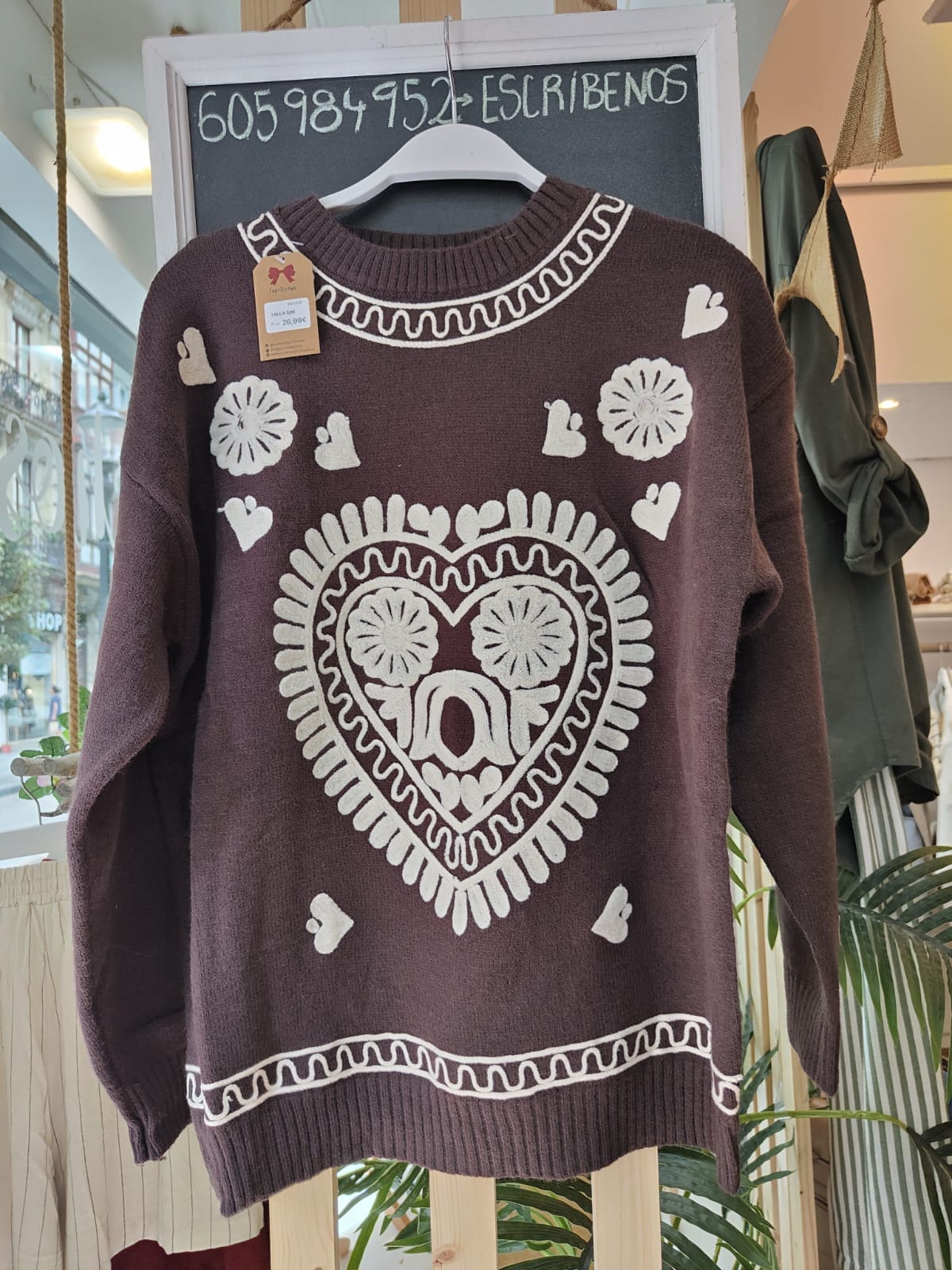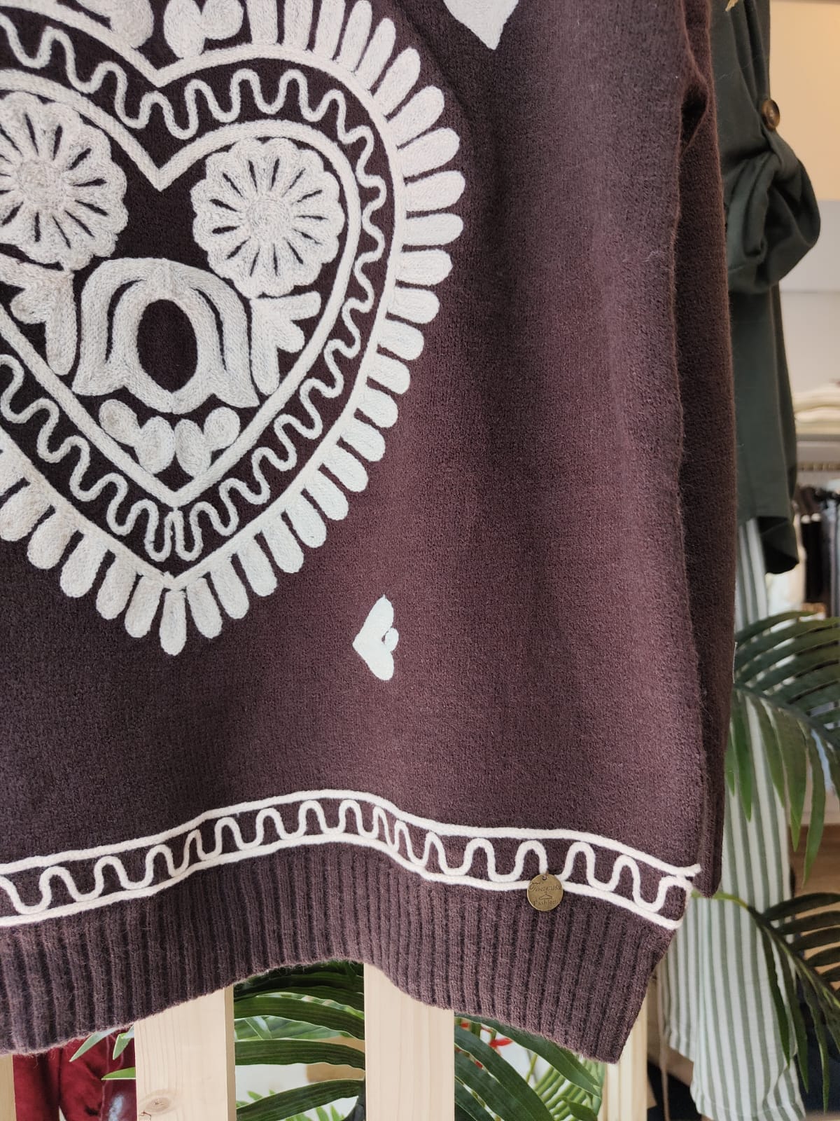 Jersey de punto en color marrón intenso con bordados en blanco en forma de corazones, flores y cenefas de inspiración étnica. Cuello redondo, corte recto y acabado en canalé en puños y bajo. Una prenda cálida y con mucha personalidad para destacar en los días fríos.