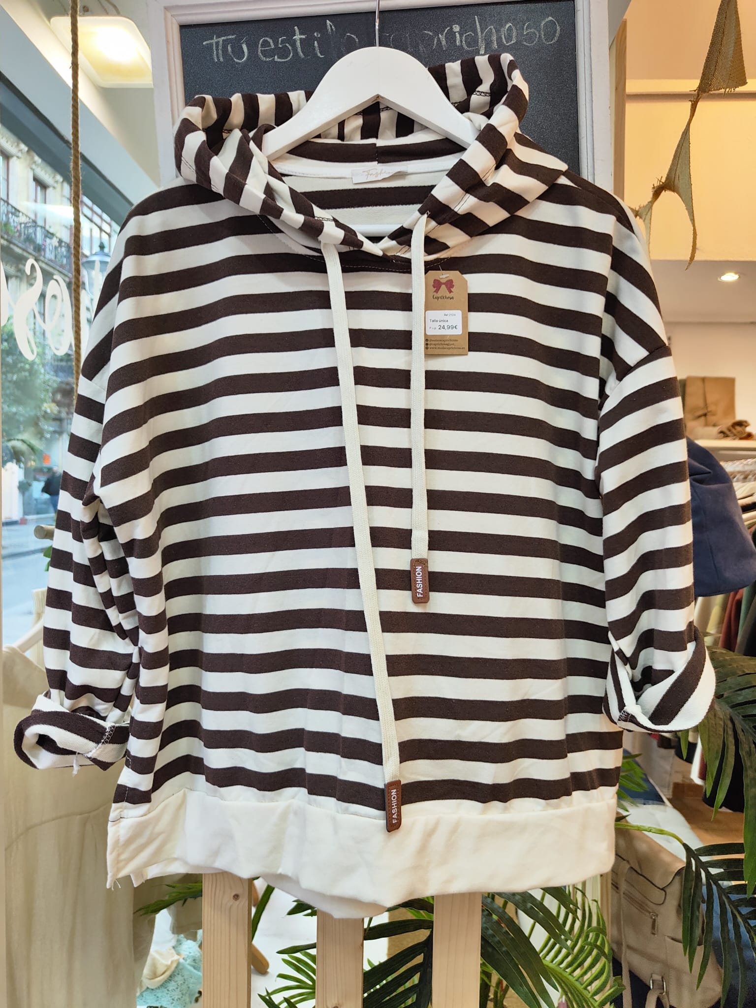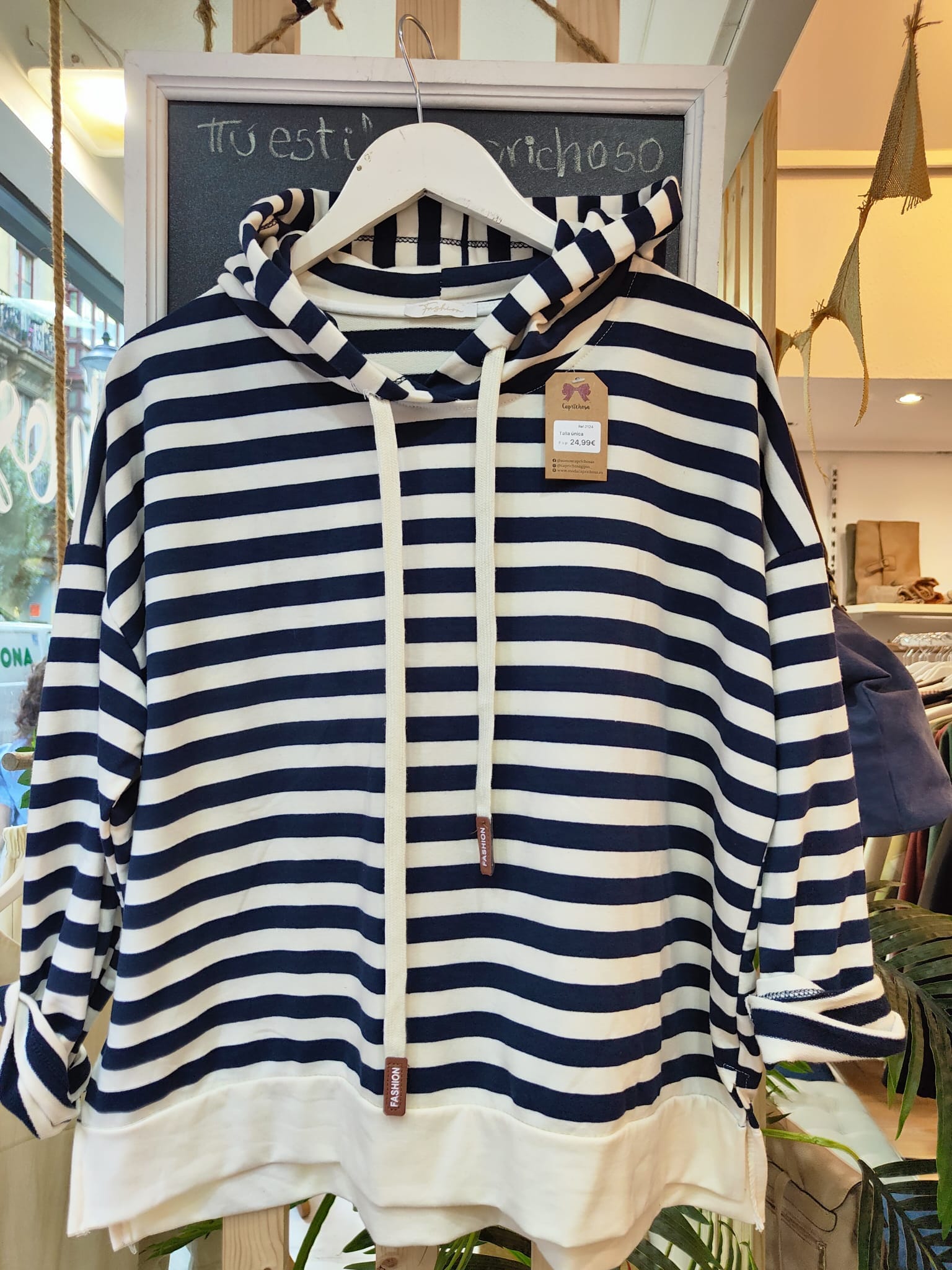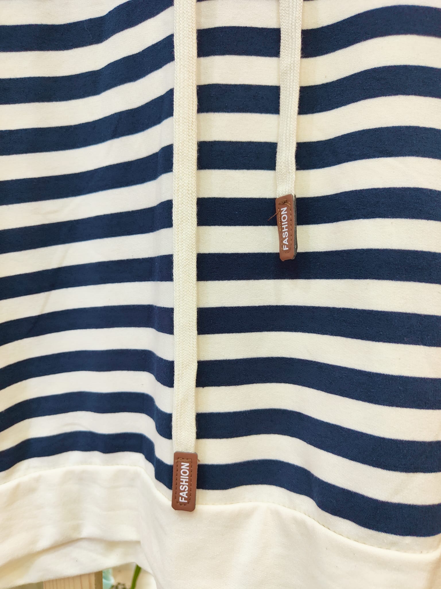Sudadra marinera, con raya azul marino y cordeles para ajustar la capucha.